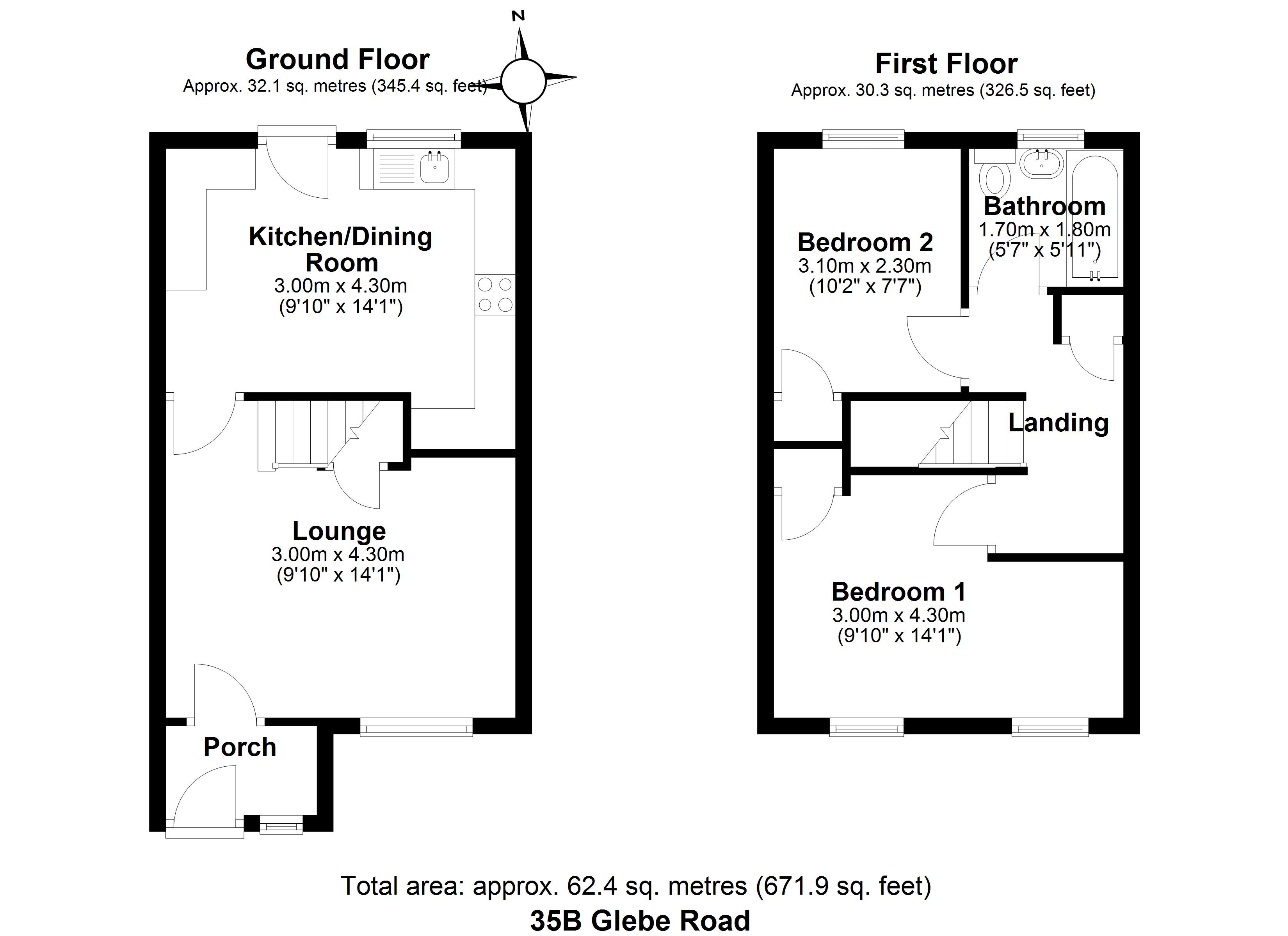 The accommodation comprises an entrance hall, a well-proportioned living room, and a modern, well-equipped dining kitchen. On the first floor are a large double bedroom, a second bedroom, and a bathroom fitted with a white suite and power shower. Externally, the property features a generously sized rear garden and private parking for two cars. PVCu double glazing and gas-fired central heating are installed throughout.